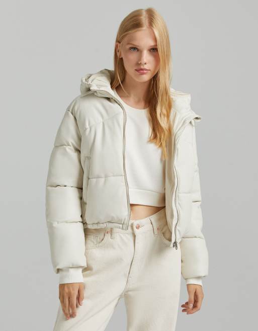 Bershka - Doudoune à capuche en similicuir - Crème