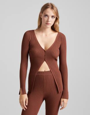 Bershka - Gilet boutonné d'ensemble en maille côtelée - Marron