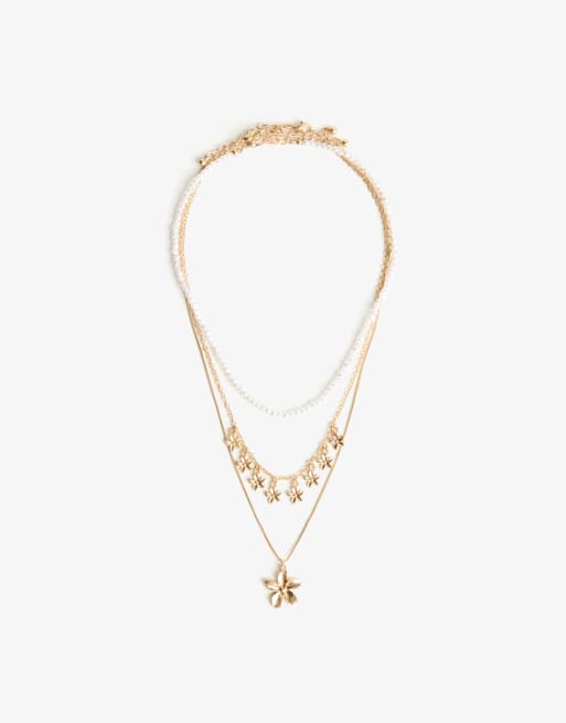 Bershka - Lot de 3 colliers avec pendentifs fleurs et perles nacrées - Doré