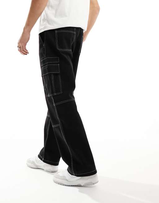 Bershka - Pantalon cargo ample à coutures contrastantes - Noir