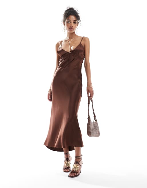 Bershka - Robe longue en satin nouée sur le devant - Marron