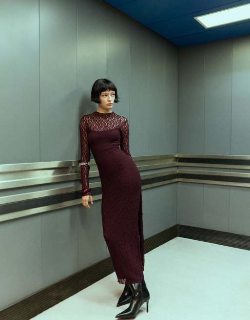 Bershka - Robe mi-longue en dentelle transparente à manches longues - Bordeaux