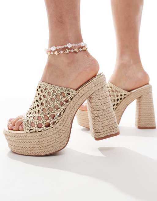 Bershka - Sandales style espadrilles à talon et semelle plateforme - Doré et naturel