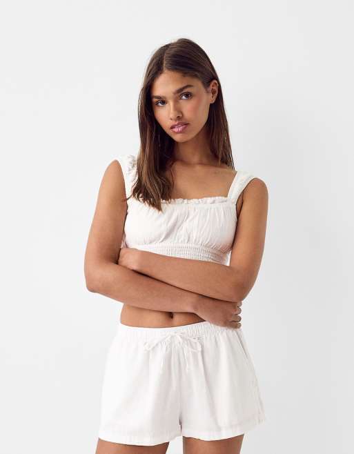 Bershka - Short aspect lin avec lien noué à la taille - Blanc