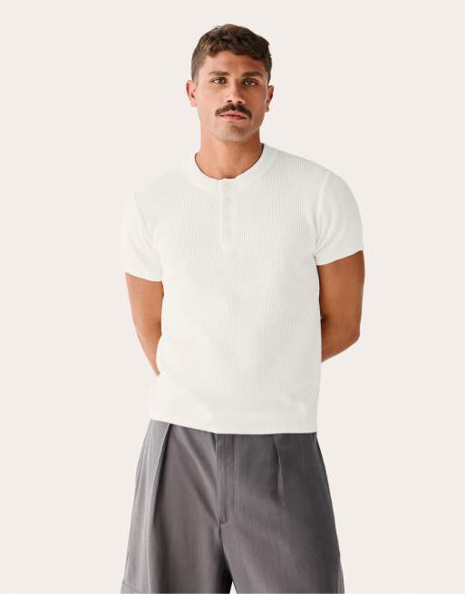 Bershka - T-shirt ajusté à manches courtes et col boutonné - Blanc