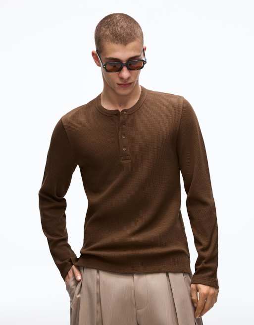 Bershka - T-shirt ajusté à manches longues et col boutonné - Marron