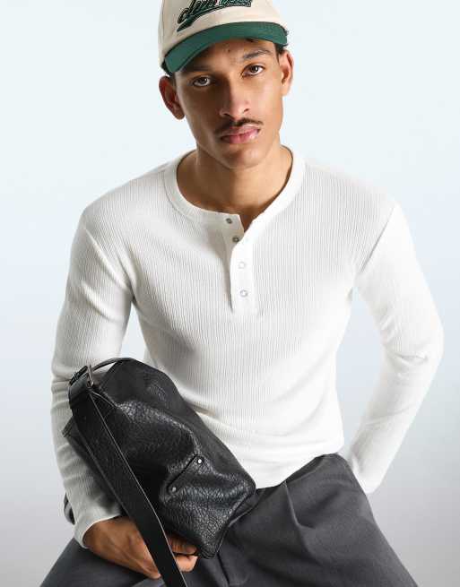 Bershka - T-shirt ajusté à manches longues et col tunisien - Blanc