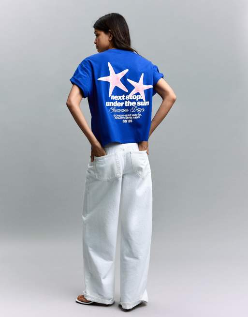 Bershka - T-shirt manches courtes oversize à imprimé - Bleu denim