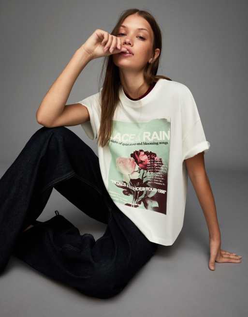 Bershka - T-shirt oversize imprimé à manches courtes - Blanc