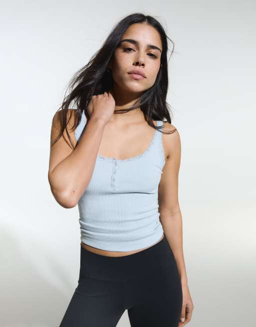 Bershka - Top en dentelle à bretelles et col boutonné - Bleu clair