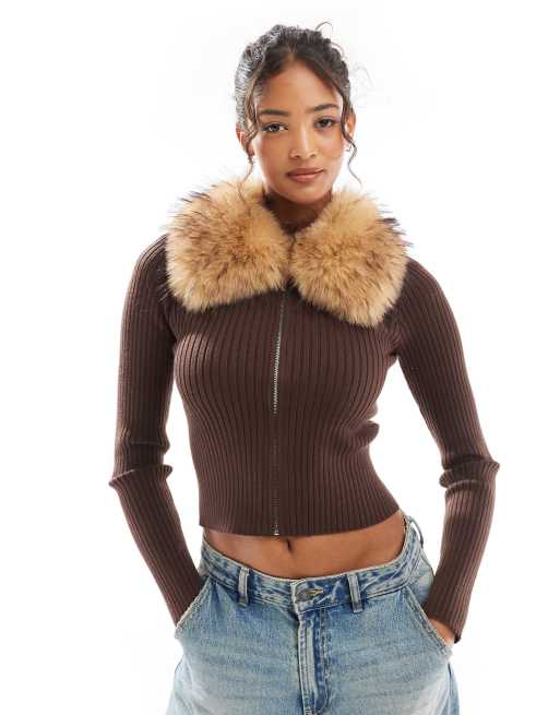Bershka - Top en maille zippé à col en fausse fourrure - Marron