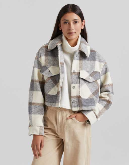 Bershka - Veste courte façon surchemise à carreaux - Gris
