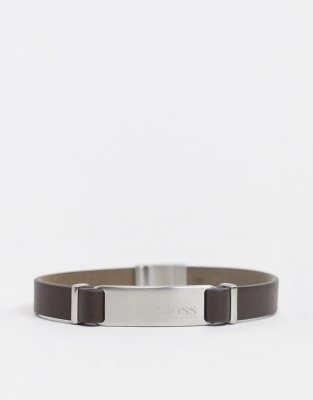 Hugo Boss - Bracelet en cuir avec fermeture argentée et étiquette d'identité - Marron