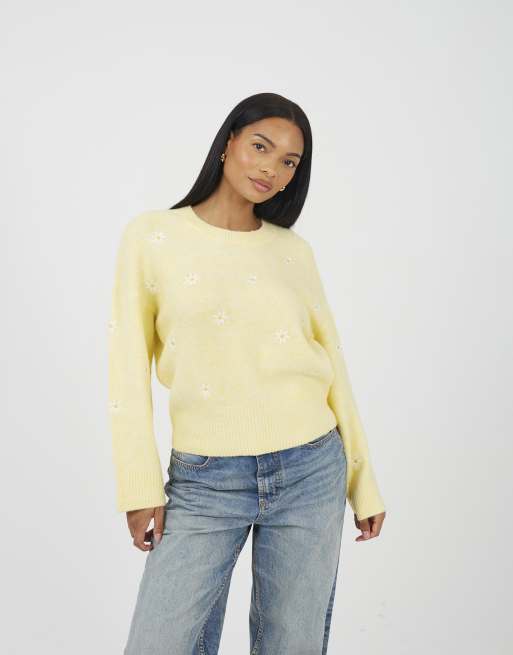 Brave Soul - Pull ras de cou doux avec marguerites brodées - Jaune