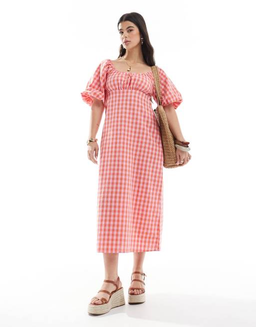 Brave Soul - Robe tendance folk à carreaux vichy avec manches bouffantes - Rose et orange