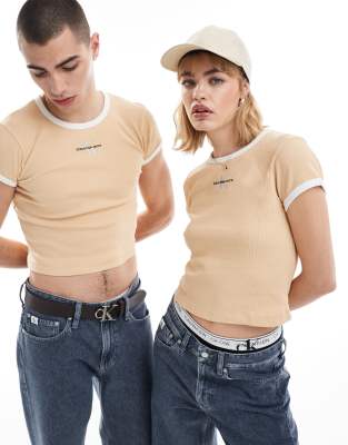 Exclusivité ASOS - Calvin Klein Jeans - T-shirt effet rétréci à bords contrastants - Beige