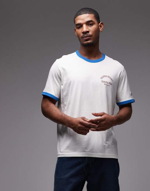 Champion - T-shirt à imprimé graphique et bords contrastants - Blanc cassé/bleu