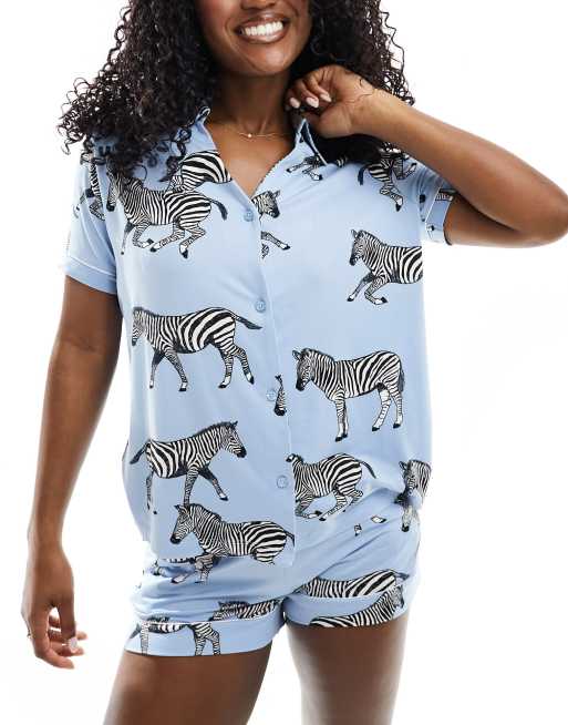 Chelsea Peers - Pyjama avec chemise col en V et short en polyester à imprimé zèbres - Bleu