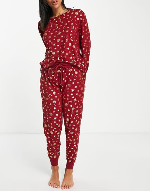 Chelsea Peers - Pyjama avec top manches longues et jogger imprimé céleste en polyester - Lie-de-vin et doré - BURGUNDY