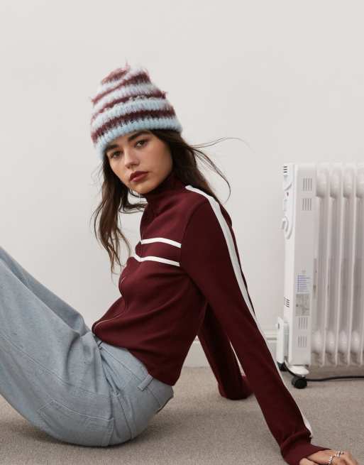 COLLUSION - Bonnet rayé en maille brossée - Bleu clair/bordeaux