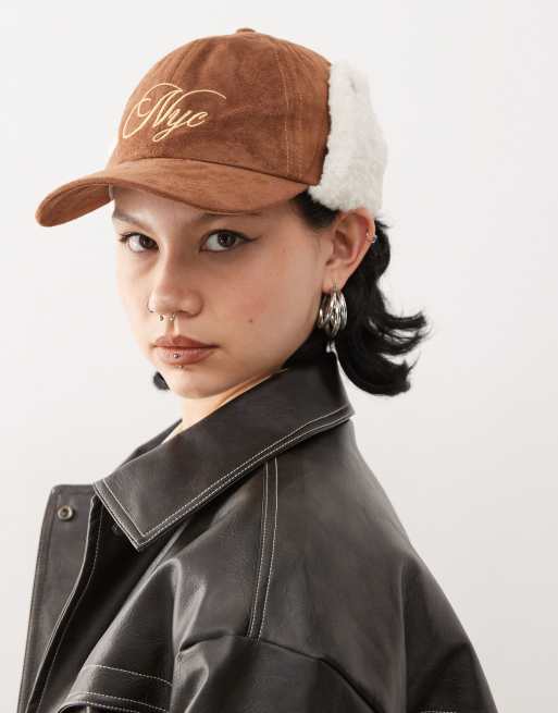 COLLUSION - Casquette style chapka avec broderie NYC en jean - Marron délavé effet sali