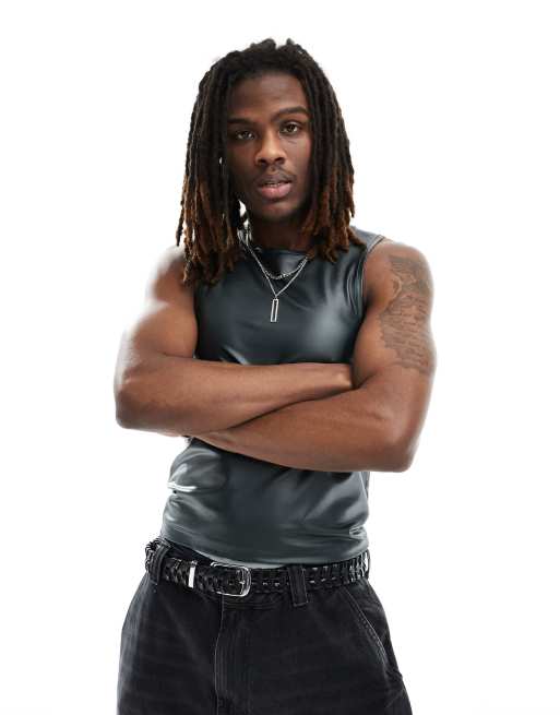 COLLUSION - Débardeur moulant style festival en PU - Kaki foncé