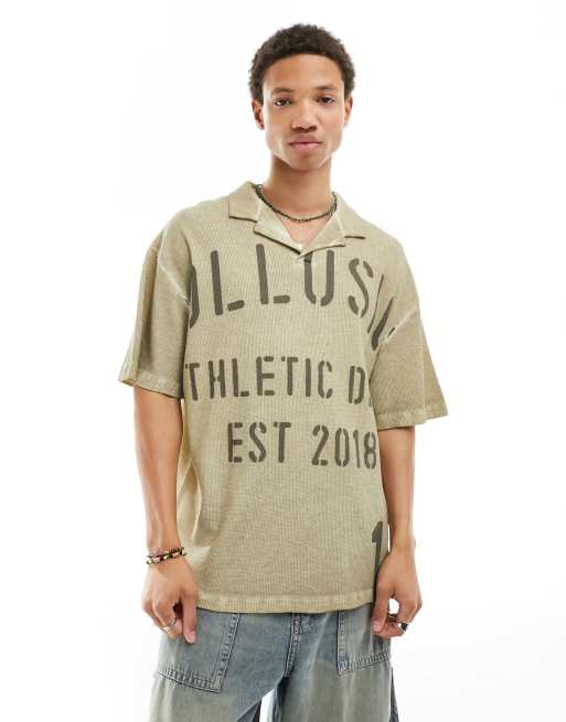 COLLUSION - Polo texturé gaufré avec imprimé graphique à l'avant - Kaki