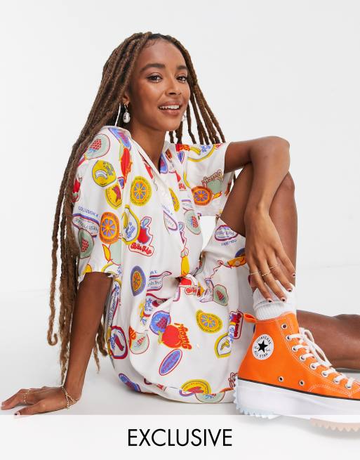 COLLUSION - Robe chemise courte à imprimé fruits avec col à revers