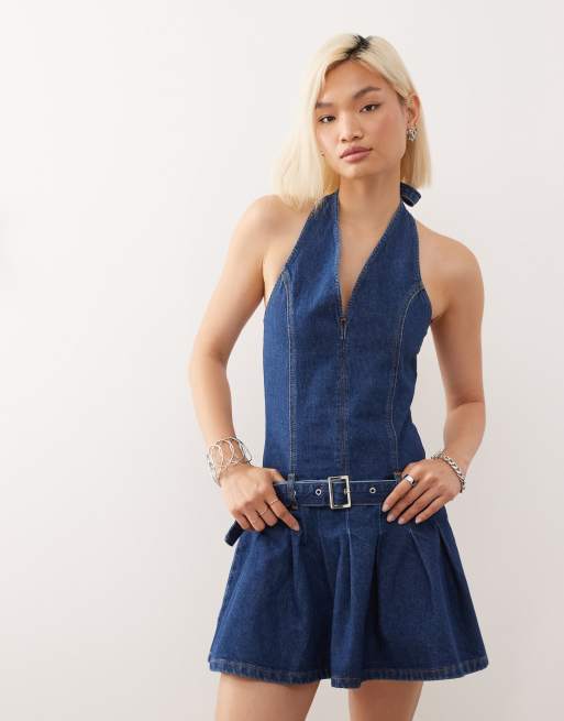COLLUSION - Robe courte dos nu en jean avec ceinture style années 90 - Bleu
