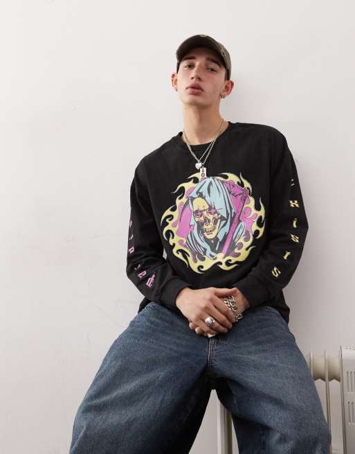 COLLUSION - T-shirt délavé à manches longues et imprimé crâne