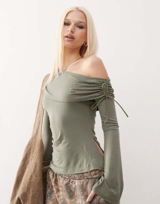 COLLUSION - Top asymétrique à manches longues et détail noué - Kaki