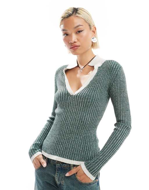 COLLUSION - Top pailleté en maille avec col V - Vert forêt