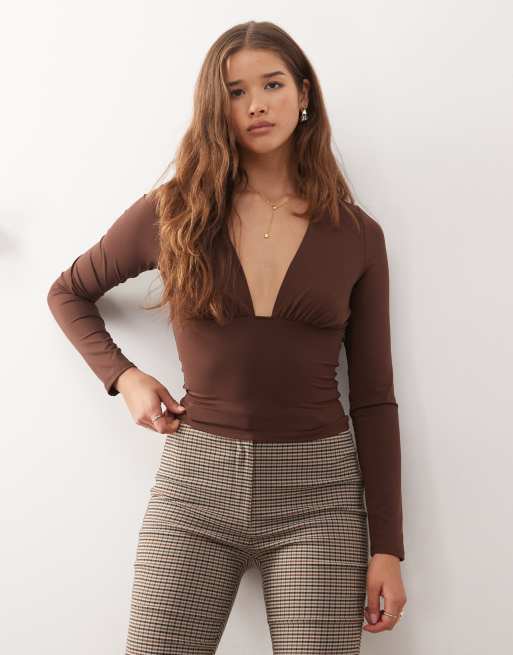 COLLUSION - Top près du corps à manches longues et col V profond - Chocolat