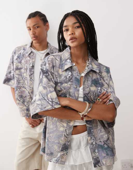 COLLUSION Unisex - Chemise en jean coupe carrée à imprimé camouflage