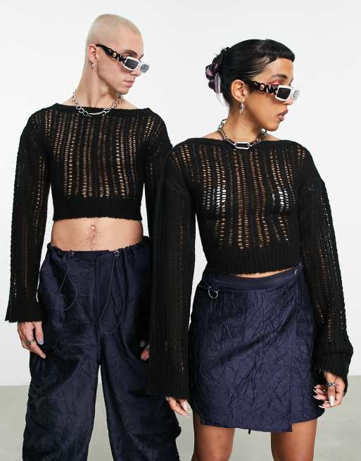 COLLUSION Unisex - Pull d'ensemble en maille ajourée à dos ouvert - Noir