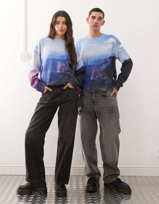 COLLUSION Unisex - Pull oversize en maille à motif paysage - Bleu délavé