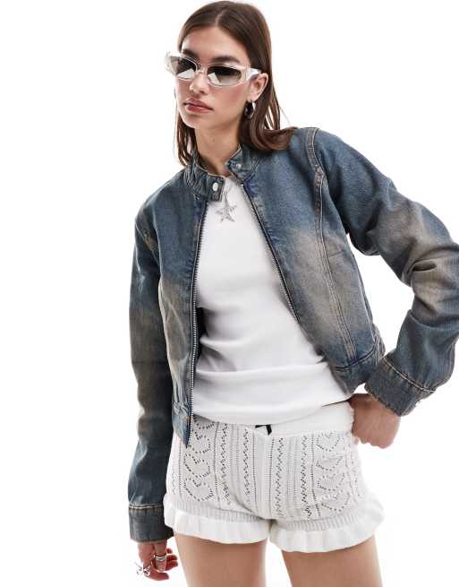 COLLUSION - Veste en jean de festival style motard - Bleu moyen délavé