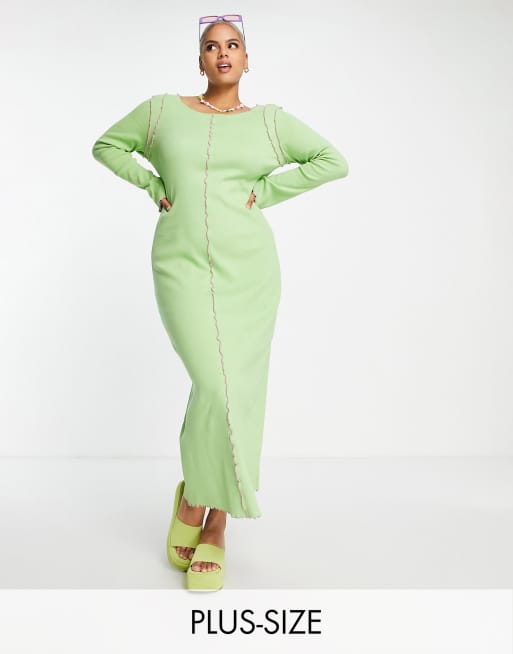 Daisy Street Plus - Robe longue moulante côtelée à manches longues et coutures contrastantes - Vert