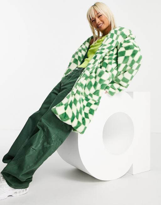 Daisy Street - Manteau mi-long en fausse fourrure avec imprimé à damier ondulé