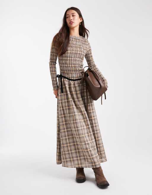 Daisy Street - Robe à carreaux longue et froncée avec taille basse et manches longues - Jaune/gris/marron