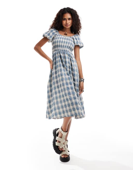 Daisy Street - Robe babydoll mi-longue à manches bouffantes avec haut froncé - Carreaux bleus