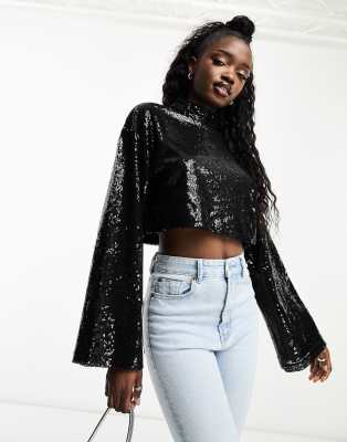 Edited - Crop top d'ensemble orné de sequins à manches évasées - Noir