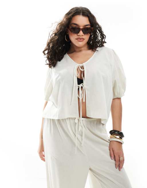 Esmée Curve - Exclusivité - Top de plage à manches bouffantes et liens devant - Grège