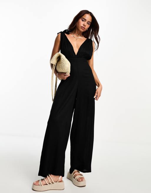 Esmée - Combinaison de plage à taille élastique et bretelles nouées - Noir