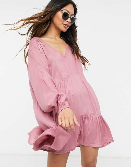 Esmee - Exclusivité - Robe d'été babydoll courte volantée à manches longues - Rose sombre