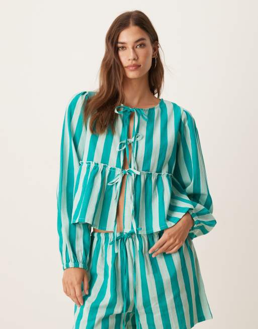 Exclusivité - Esmée - Top de plage d'ensemble noué devant à manches longues - Vert à rayures