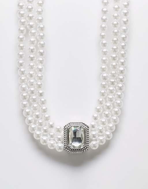Faded Future - Collier triple rangée à perles fantaisie avec breloque cristal - Argenté