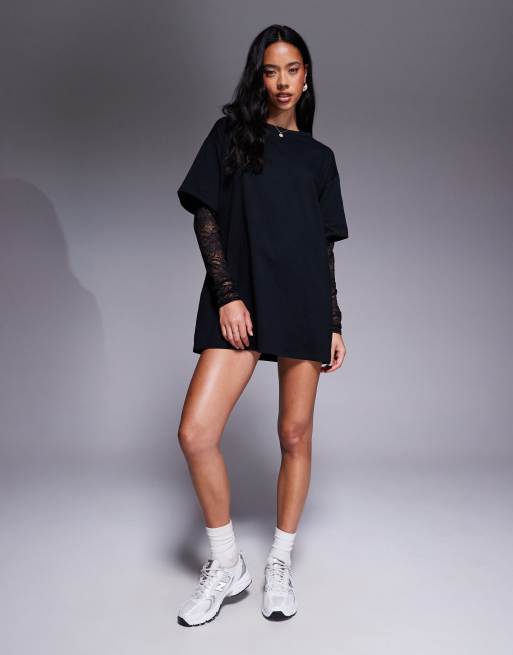 Fashionkilla - Robe t-shirt courte en coton avec manches en dentelle - Noir