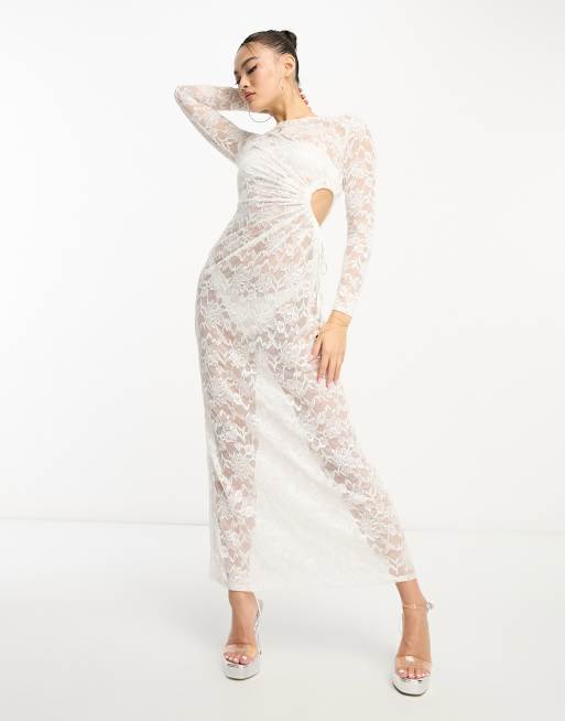 Flounce London - Robe longue froncée transparente en dentelle - Ivoire