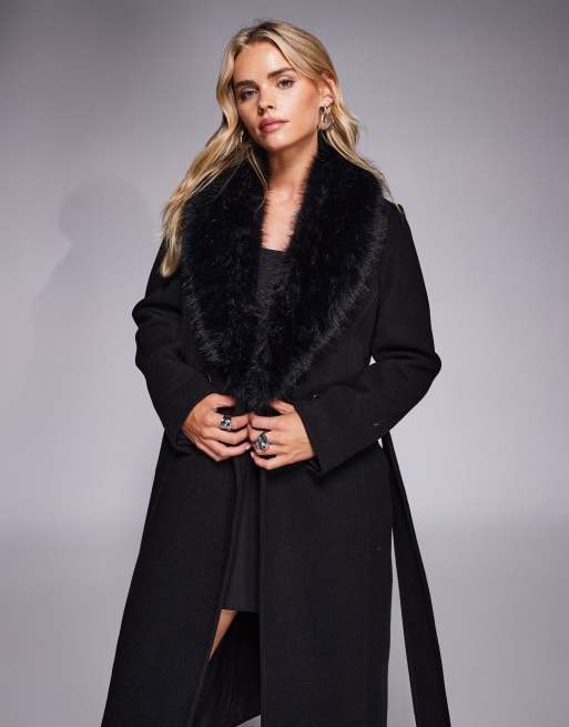 Forever New Petite - Manteau long avec col en fausse fourrure - Noir